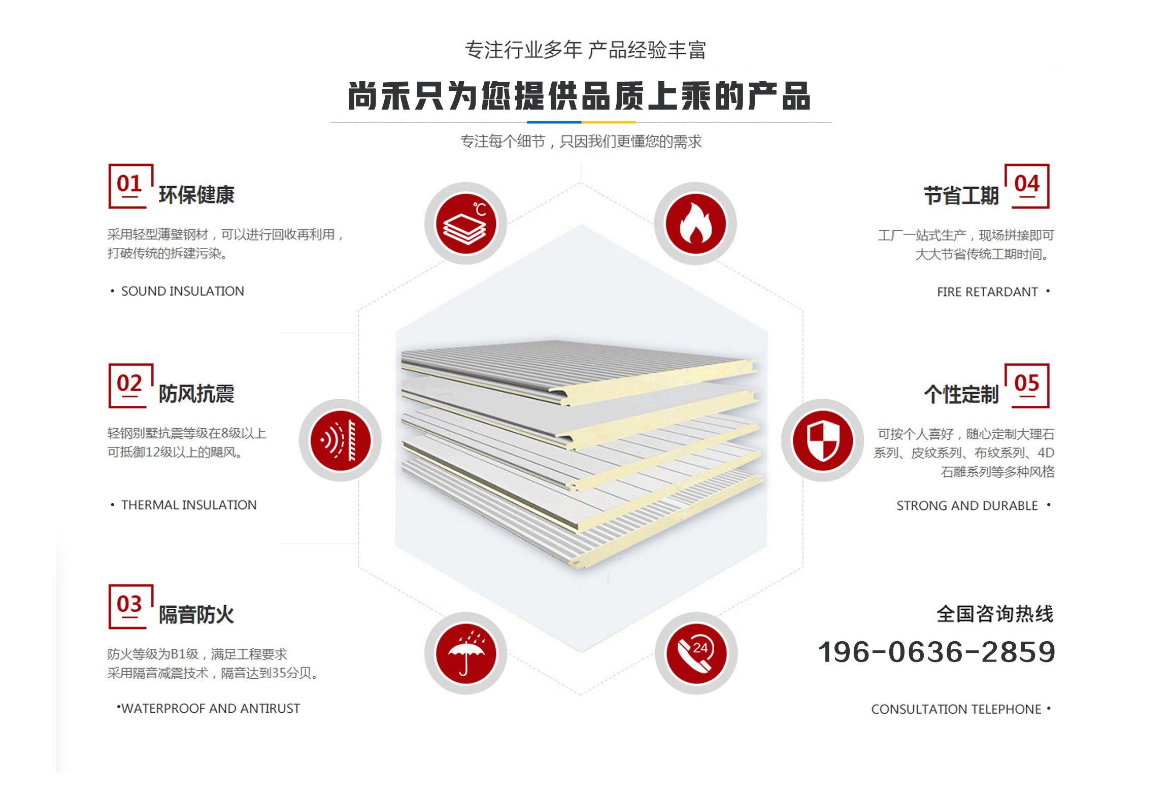 山東尚禾經貿有限公司是集板材設計、研發(fā)、生產、施工、一體化的科技公司,并在同行業(yè)中率先通過了質量、環(huán)境、安全管理體系認證。公司2011年投入資金2000余萬元引進世界先進的聚氨酯節(jié)能板連續(xù)生產線、意大利進口發(fā)泡系統,采用六組份在線自動操作混合澆注技術,在線一次性完成社會配料中心或工廠的配比混合工藝,并可以根據溫度在線自動調整,從而生產處與眾不同的高強度、節(jié)能型、綠色環(huán)保的聚氨酯夾芯板。(其使用年限高于同行業(yè)其他品牌5-10年) 公司主要經營范圍包括聚氨酯夾芯板,PU夾芯板,冷庫板,潔凈板,聚氨酯冷庫板,冷庫保溫板的設計、生產、銷售、技術指導、安裝及一體、以及進出口業(yè)務,是中部六省最大的綠色節(jié)能建材生產基地。聚氨酯夾芯板年產200萬平方米、PU夾芯板、冷庫保溫板500萬平方米、鏈整產業(yè)綜合實力,開創(chuàng)了六省至中西部創(chuàng)新型中小名企總部基地,并將著力推進中國中西部地區集成房屋住宅產業(yè)化發(fā)展進程。 科技創(chuàng)新、節(jié)能典范。千萬間始終秉承“誠信、合作”的企業(yè)文化精髓,長期致力于鋼板材結構節(jié)能建筑產業(yè),愿與社會各界攜手合作,共鑄綠色、環(huán)保美好未來。 產品具有良好的絕熱、阻燃、隔音、環(huán)保、耐久性能,可廣泛應用于工業(yè)、商用建筑內外墻、以及民用建筑外墻保溫、空調通風系統、專用防火保溫門等領域。 我們始終秉承...